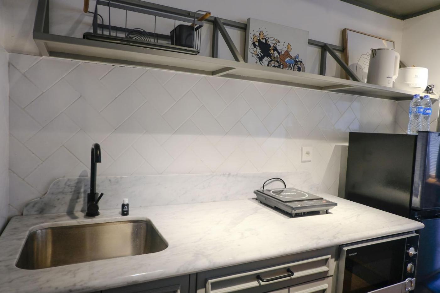 Studio Apartment. The air-conditioned apartment has 1 bedroom, 1 bathroom with a shower and a kitchen. Guests can make meals in the kitchen that has a stovetop, a refrigerator, a microwave and an electric kettle. This apartment features a seating area and a TV with cable channels. The unit has 1 bed.